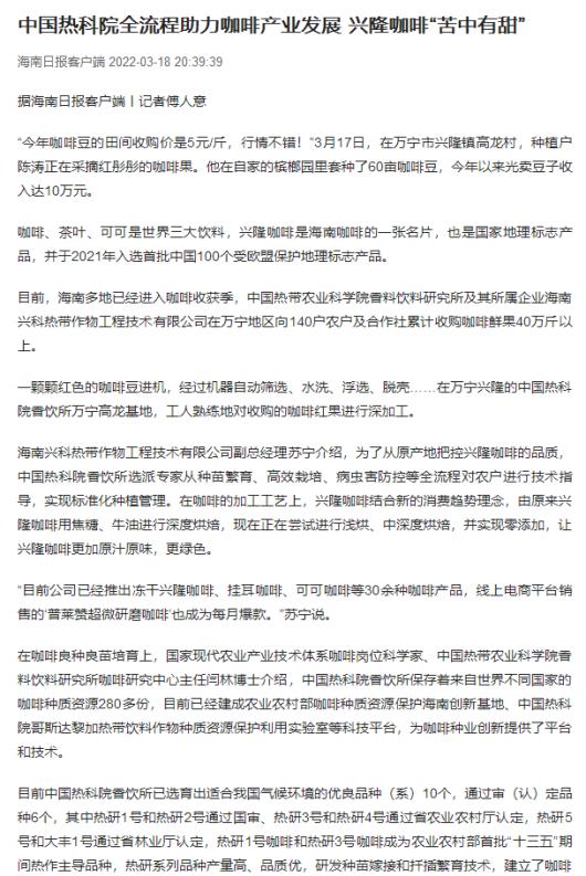 【海南日报】中国热科院全流程助力咖啡产业发展 兴隆咖啡“苦中有甜”