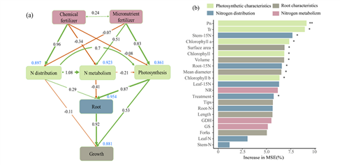 本研究综合运用中宇宙实验和15N同位素示踪技术,分析微肥对叶面氮肥的氮分配和NUE特征,并联合结构方程和随机森林模型等方法,系统考察微肥通过氮代谢、光合作用、根系发育提升NUE的关键机制和预测因子。结果显示,单独施用叶面氮肥遵循收益递减规律,氮积累、生物量和根系发育阈值出现在1%N处理。结构方程模型表明,单施氮肥主要通过调控根系发育和氮素分配影响生物量形成,而过量施氮则会抑制蒸腾作用及氮向根系转运,导致根系发育受阻。微肥配施则通过增强氮同化、光合作用与根系发育的协同,促进氮代谢过程,进而提升光合作用及NUE。随机森林分析进一步识别出光合速率、蒸腾速率、茎-15N、根-15N、根形态为微肥增效的关键预测因子。本研究证明了微肥配施叶面氮肥在优化橡胶树幼苗氮代谢和NUE的有效性和机制,为橡胶林氮素高效管理提供了理论依据。