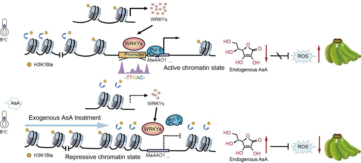 近日,中国热科院生物所香(大)蕉研究团队在缓解香蕉果实低温冷害的分子机制研究方面取得新进展,研究揭示了外源AsA通过改变组蛋白乳酸化修饰水平,驱动MaWRKYs-MaAAO1调控模块的染色质重塑,缓解香蕉果实冷害的作用机制。研究成果为保持热带水果的果实品质提供了新的策略。