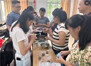 信息所精心设计趣味手工互动环节,开展了南药驱蚊香包制作、艾草养生锤、何首乌手工洗发皂制作活动体验活动。用丁香、薄荷、白芷、香茅草、豆蔻等16种南药原料,在工作人员的指导下,按照“驱蚊”“安神”“疏肝解郁”等功能配方装入精美的香囊袋;用何首乌提取物配合天然原料,制作出具有养发功效的手工皂;用晒干的艾草揉成紧实的圆球,用棉布包裹后插入木柄,形成艾草养生锤。大家相互交流制作心得,在一缠一绕中感受传统手工的乐趣。这些实用制品让南药更好地融入日常生活。